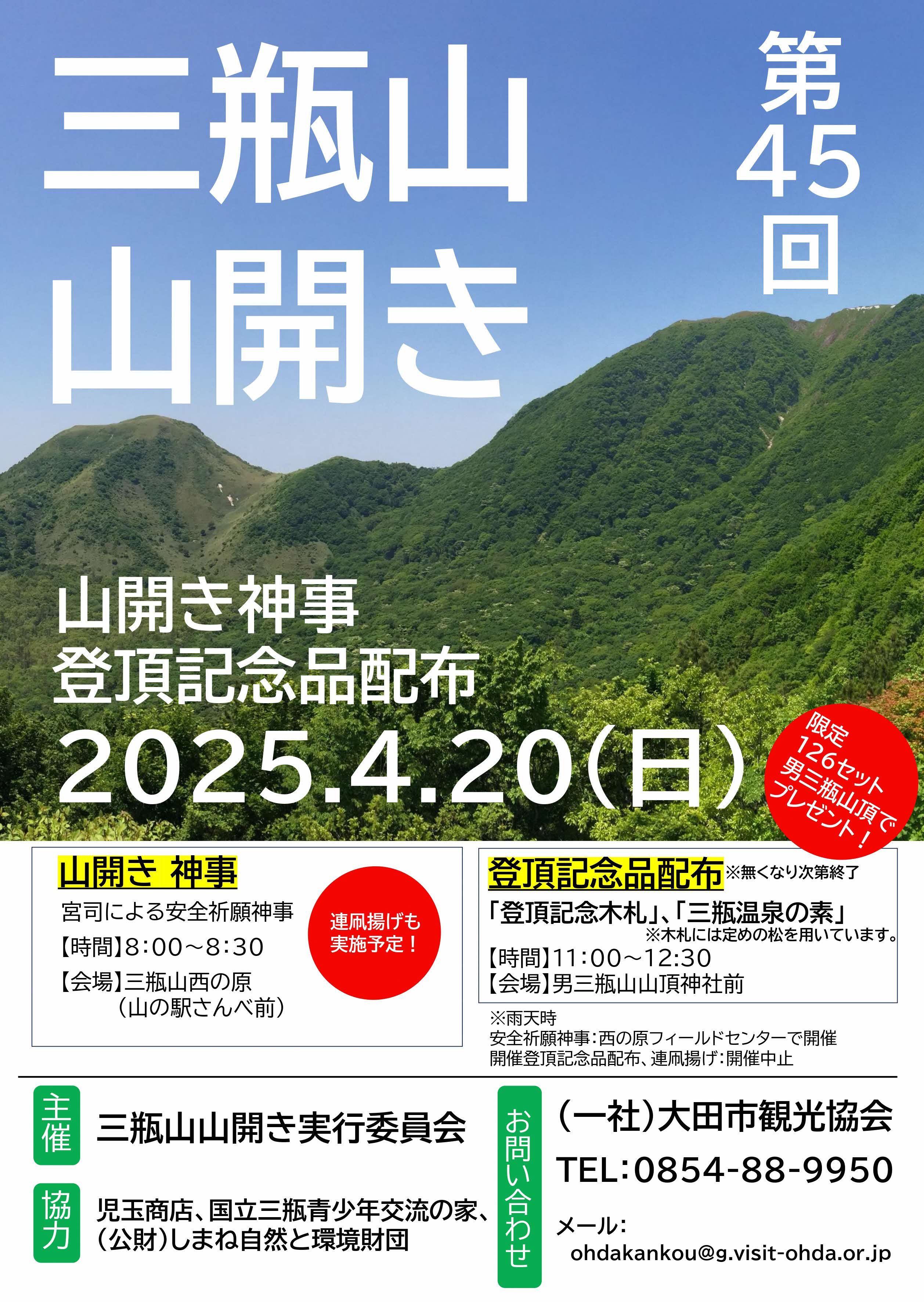 ※当日は天候不良が予想されるため、登頂での記念品配布は西の原での配布に変更となりました。(R7.4.17修正)