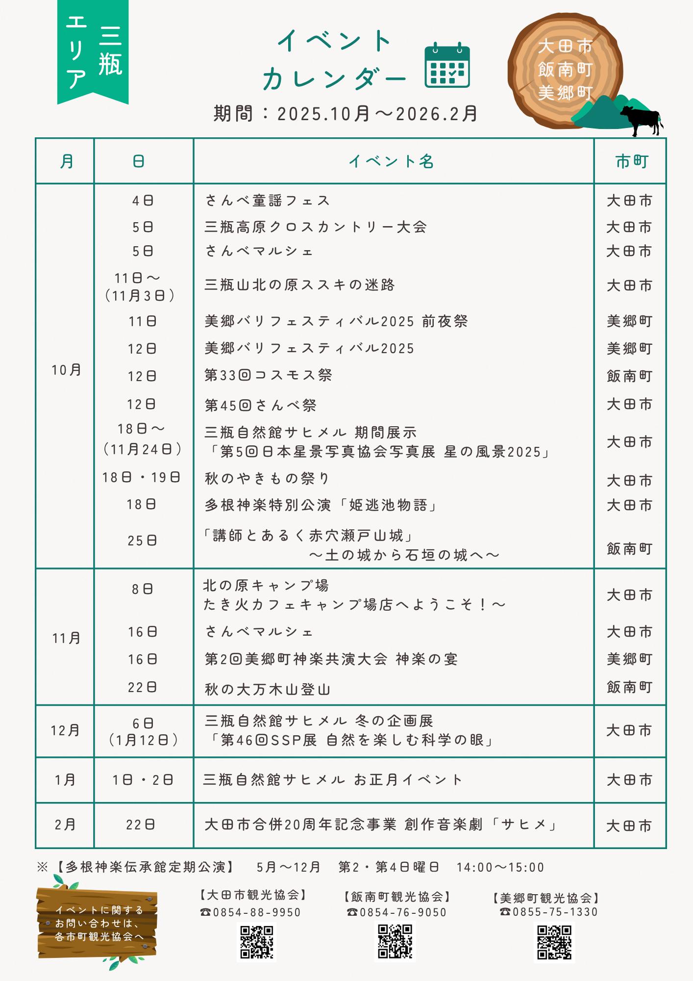 トップ 新着・お知らせ・イベント情報 三瓶エリア【イベントカレンダー】(2025.10~2026.2) 三瓶エリア【イベントカレンダー】(2025.10~2026.2) 2025年07月23日 三瓶エリア(大田市・飯南町・美郷町)のイベントカレンダー✨ お出掛けの参考に☺♪