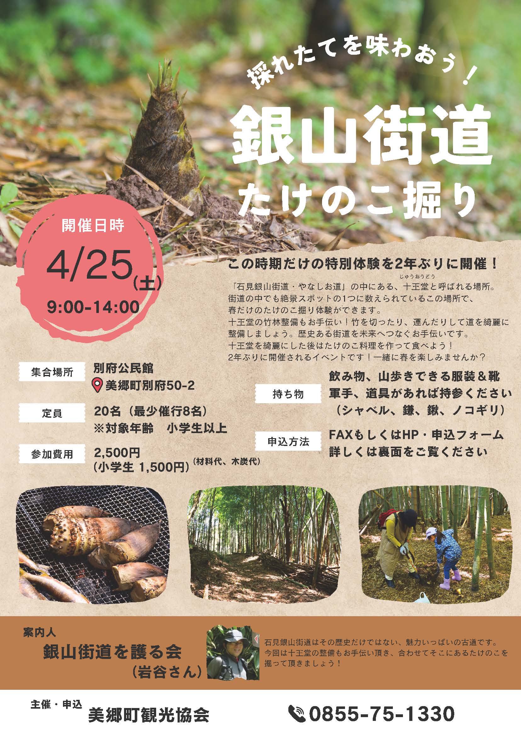 美郷町の石見銀山街道はその歴史だけでなく、魅力いっぱいの古道です。今回は十王堂の整備もお手伝い頂き、合わせてそこにあるたけのこを掘って頂きましょう!
