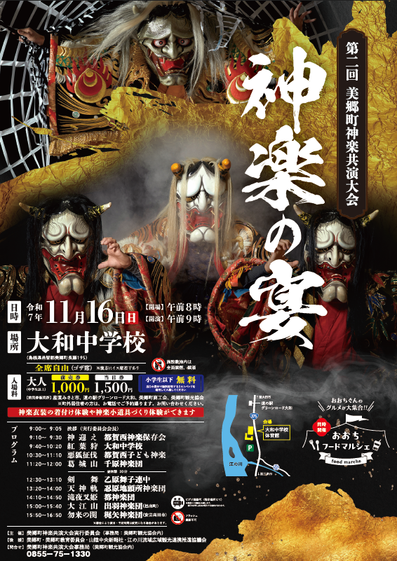 今回は、広島、邑南町の神楽団や指導で携わっている大和中学校生徒の演舞の発表もあります。